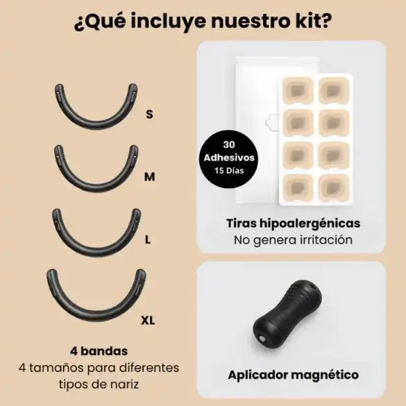 Debes limpiar la piel, secarla bien y colocar las almohadillas adhesivas a cada lado del puente de la nariz, nunca sobre las fosas nasales. Luego se ajusta el puente magnético hasta sentir una mejor apertura.